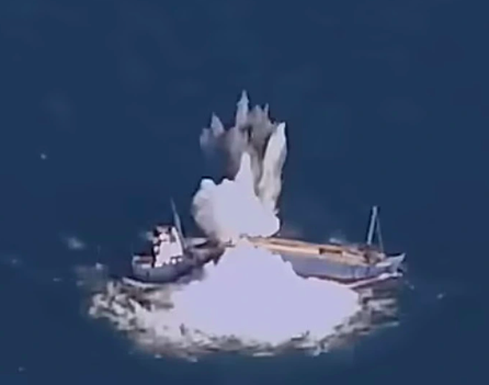 Sau đó, tiêm kích F-15E Strike Eagle thả quả bom JDAM có tên Quicksink đang được thử nghiệm vào tàu chở hàng. Ngay lập tức, tàu chở hàng vỡ làm đôi (video dưới, nguồn: Daily Mail).