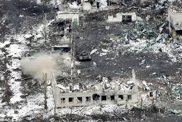 Hỏa lực của xe tăng Nga, được quay vào ngày 19/2, càng làm tăng thêm sự hủy diệt, tấn công những nơi dường như là vị trí của Ukraine giữa đống đổ nát.