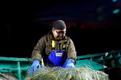 Ông Haruo Ono gỡ lưới sau chuyến đánh bắt đêm. Ảnh: Reuters.
