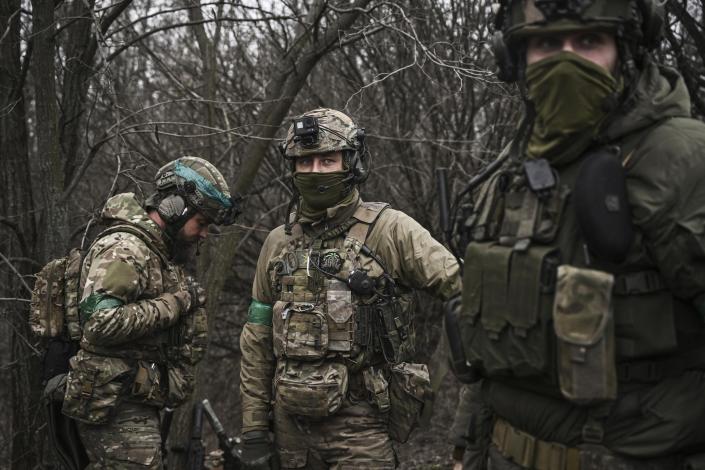 Các thành viên đơn vị đặc nhiệm Ukraine đứng trong rừng, gần Bakhmut ngày 15/3. Ảnh AFP