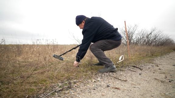 Ông Oleksandr Havriluk - Một nông dân Ukraine dùng tay bới mìn phá xe tăng trên cánh đồng của mình. Ảnh CNN