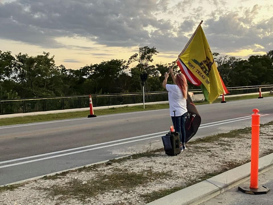 Những người ủng hộ ông Trump vẫy cờ và hô khẩu hiệu bảo vệ vị cựu tổng thống Mỹ. Một số người lái xe qua khu vực biểu tình đã nhấn còi để thể hiện sự ủng hộ. Ảnh: WPEC.