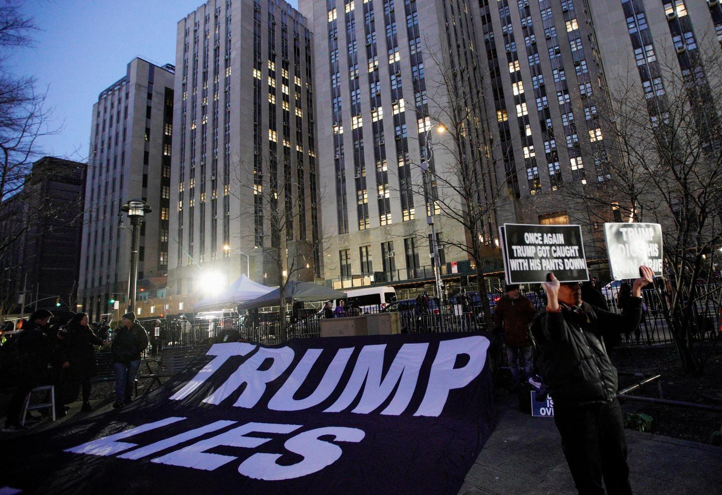 Biểu ngữ khổng lồ bên ngoài Ṭa án H́nh sự Manhattan, New York, với ḍng chữ: "Ông Trump nói dối" vào ngày 30/3. Ảnh: Reuters.