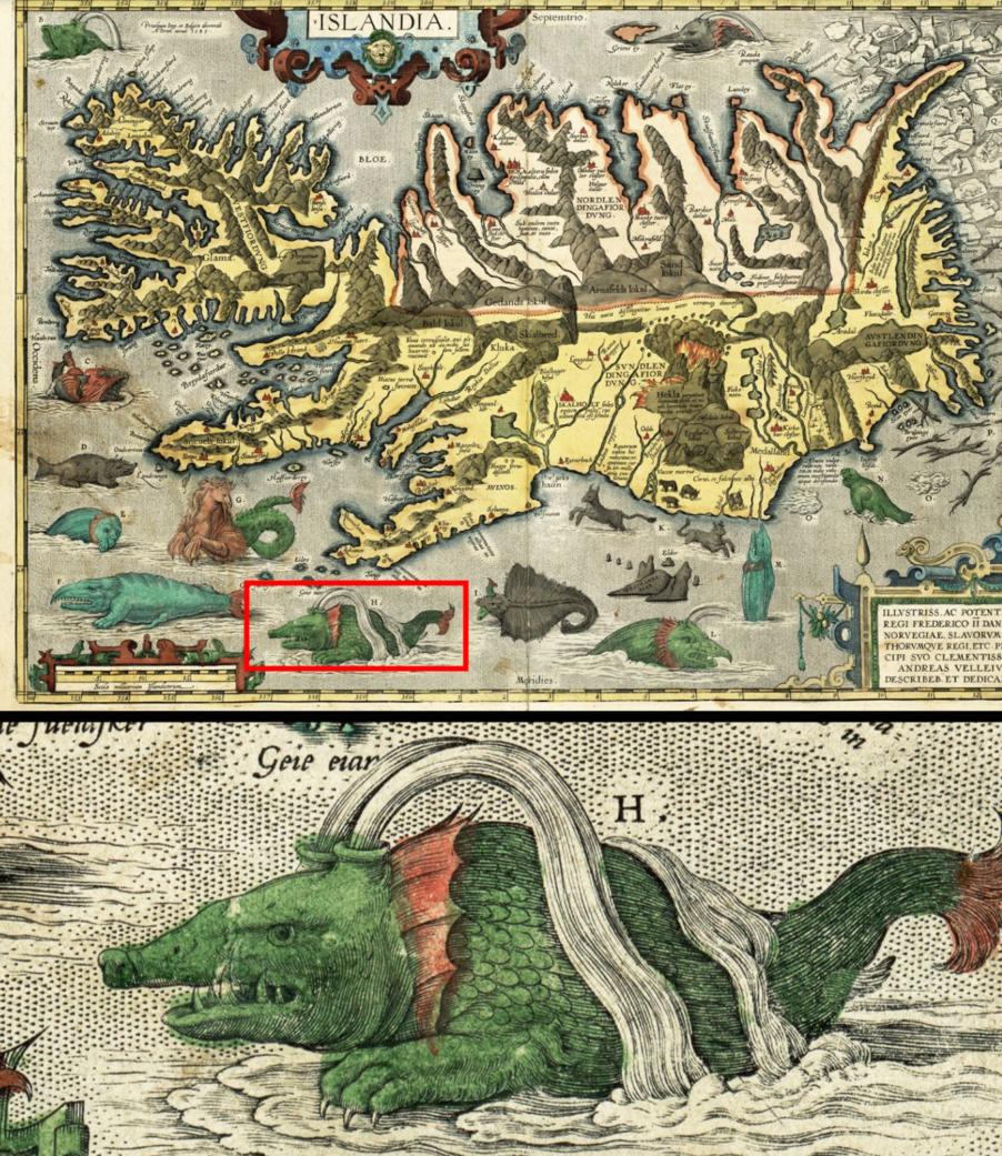 Trong bản đồ Iceland năm 1658 của Ortelius, Hafgufa được miêu tả là một sinh vật biển cực lớn, rất xảo quyệt và có thể nuốt chửng tàu bè và con người (Ảnh: Earthly Mission)