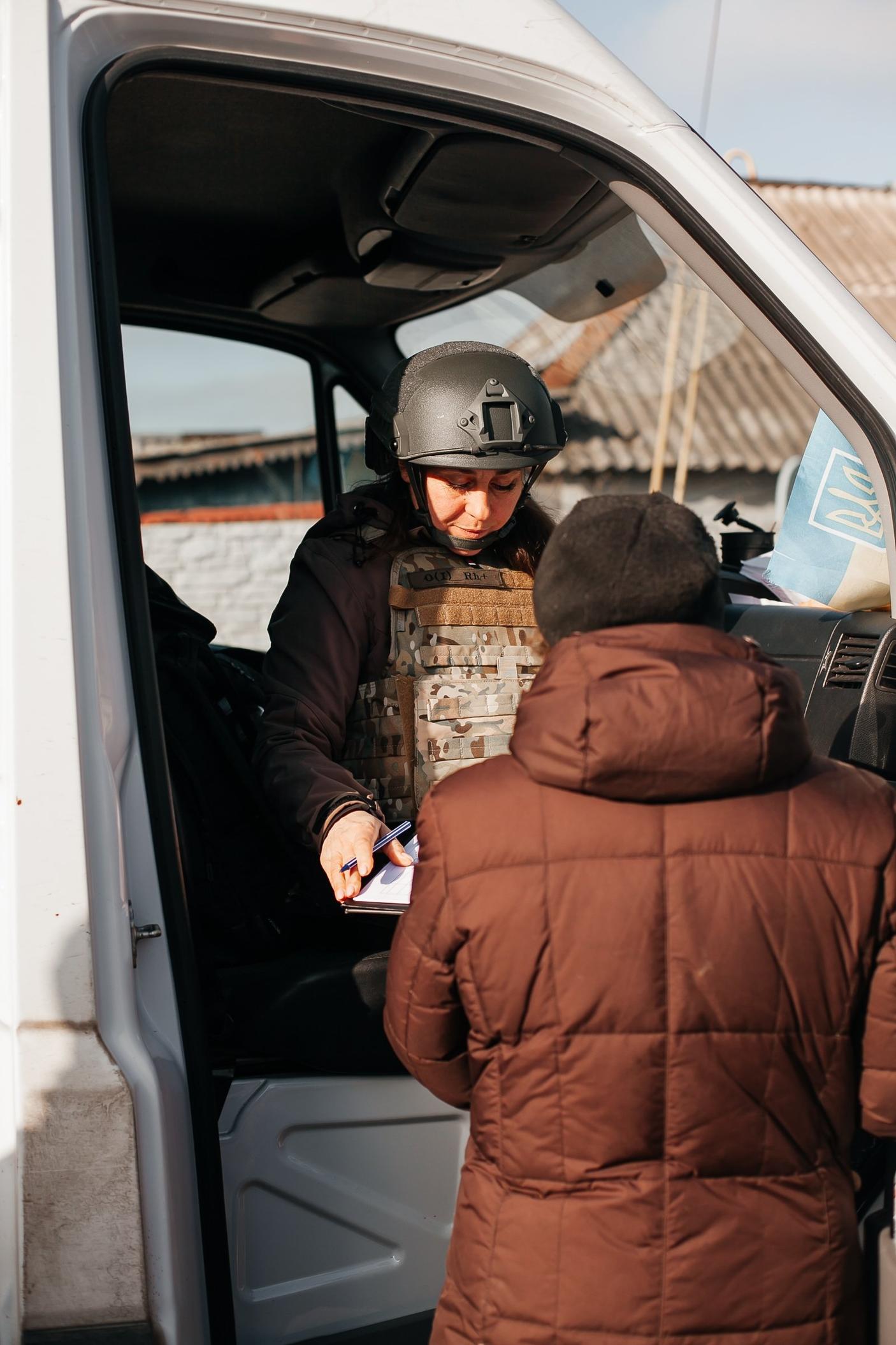 Anna cung cấp viện trợ và hỏi dân làng cần gì cho lần tới. (Ảnh: Christian Aid/Heritage Ukraine)