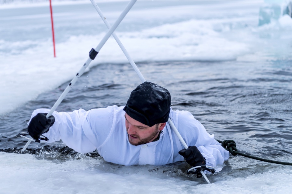 Thủy quân lục chiến Hà Lan trèo ra khỏi mặt băng. Ảnh: Bộ Quốc phòng Hà Lan.