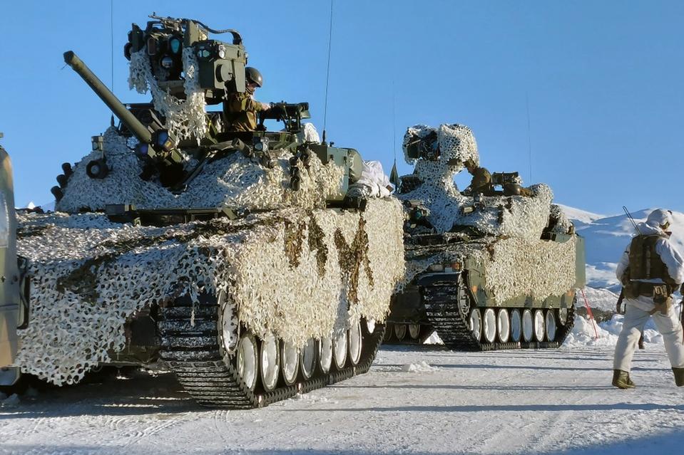 Xe chiến đấu bộ binh CV90 gần Bardufoss, Na Uy, trong cuộc tập trận chung Viking với lực lượng NATO vào ngày 8/3. Ảnh: Bloomberg.
