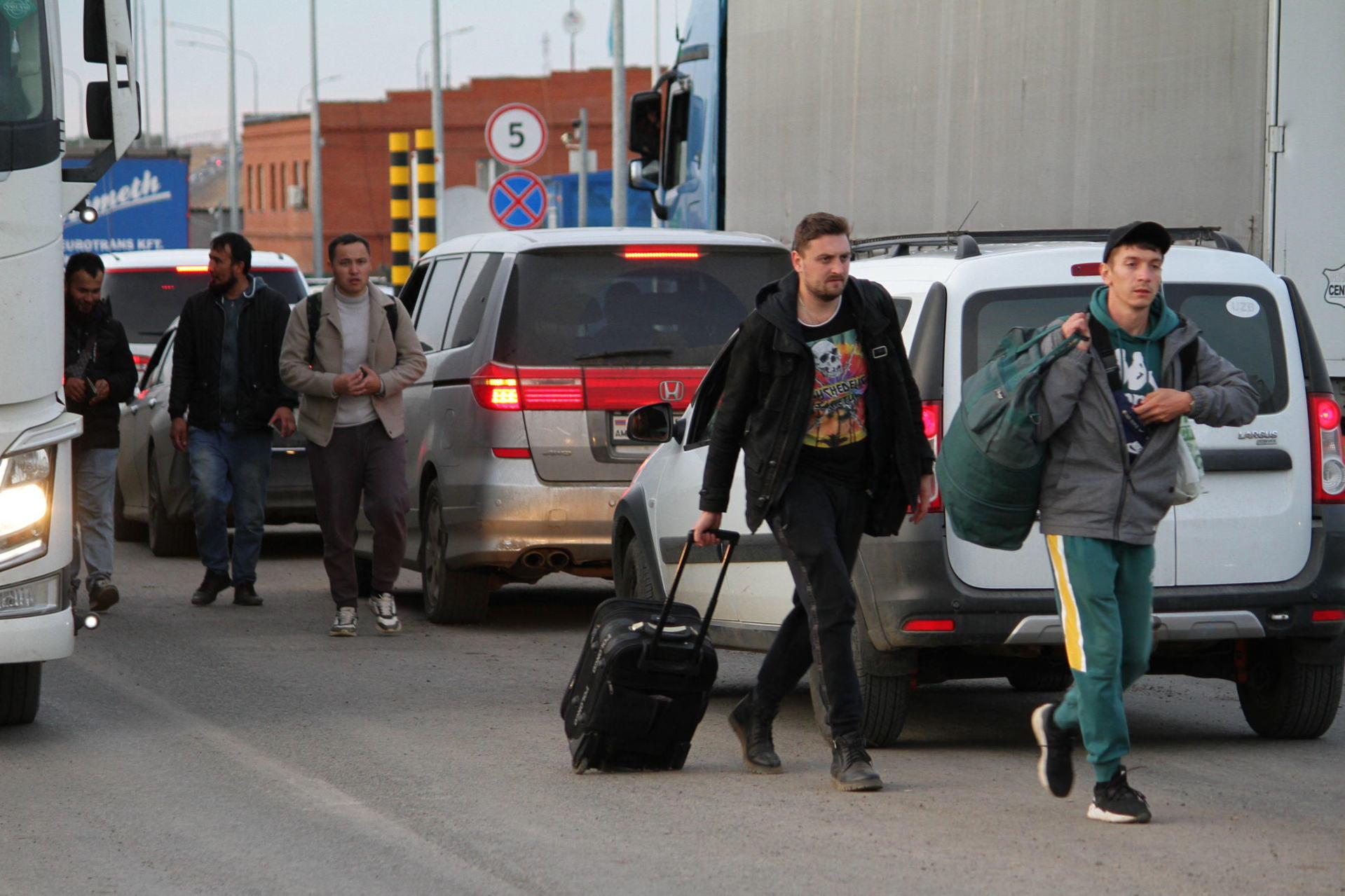 Cảnh thanh niên Nga ồ ạt đi qua biên giới với Kazakhstan nhằm trốn lệnh quân dịch của Tổng thống Vladimir Putin ban hành hồi tháng 9/2021. (Hình: Stringer/AFP via Getty Images)