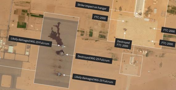 Tiêm kích MiG-29 của không quân Ai Cập bị lực lượng bán quân sự Sudan giữ lại tại căn cứ không quân Merowe gần thủ đô Khartoum. Hình ảnh vệ tinh cho thấy ít nhất một trong ba tiêm kích MiG-29 này bị phá hủy hoàn toàn, hai chiếc còn lại bị hư hỏng nặng.