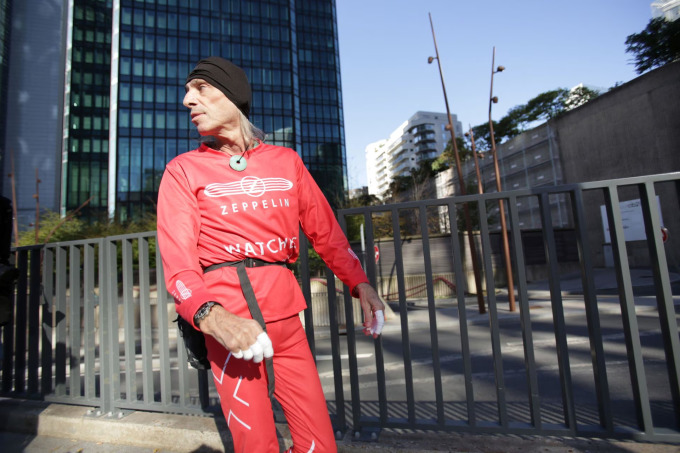 Alain Robert trả lời truyền thông trước khi leo tòa nhà chọc trời Tour Alto, Paris, ngày 19/4. Ảnh: Reuters