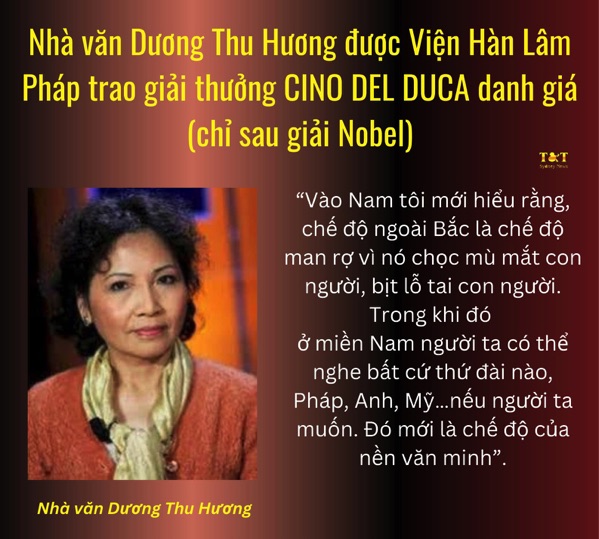 Vào ngày 21 tháng 4 năm 2023, dưới sự đề xuất, với đa số tuyệt đối, của Hội đồng Giải Cino Del Duca Thế giới, do bà Hélène Carrère d’Encausse, Thư kư Thường trực của Viện Hàn lâm Pháp làm chủ tịch, Ủy ban Quỹ Del Duca, do Xavier Darcos, Đổng lư văn pḥng của Institut de France, thuộc Viện Hàn lâm nước Pháp, đă trao Giải thưởng Thế giới 2023, trị giá 200.000€, cho bà Dương Thu Hương, nhà văn Việt Nam đang sống tại Pháp.