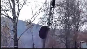 Bị gấu khổng lồ leo lên cây truy đuổi, người đàn ông cố gắng xua đuổi con vật nhưng nó quyết không từ bỏ ý định và leo lên cao hơn.