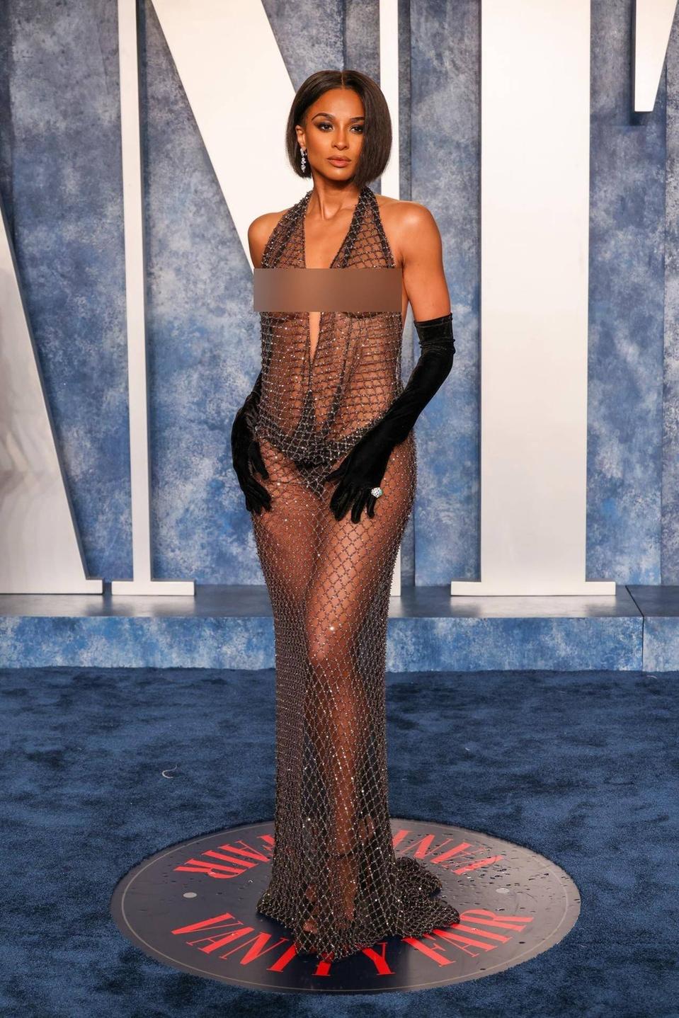 Trong bữa tiệc sau lễ trao giải Oscar do Vanity Fair tổ chức hôm 13/3 (giờ Mỹ), các sao nữ thi nhau tạo dáng với trang phục gợi cảm, khoe khéo vóc dáng. Để nói về độ táo bạo nhất, chắc hẳn là Ciara. Giọng ca Level Up diện bộ váy lưới xuyên thấu với phần cổ áo khoét sâu, lộ cơ thể. Trang phục được tô điểm bằng đá pha lê, giúp tăng độ lấp lánh cho tổng thể.