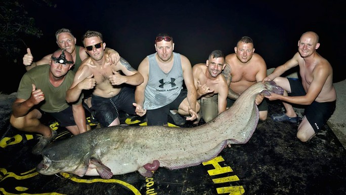 Một con cá trê Wels nặng gấp đôi so với mức trung bình bị một nhóm người Anh bắt được khi đi nghỉ ở Mequinenza - Tây Ban Nha. Ảnh: SWNS