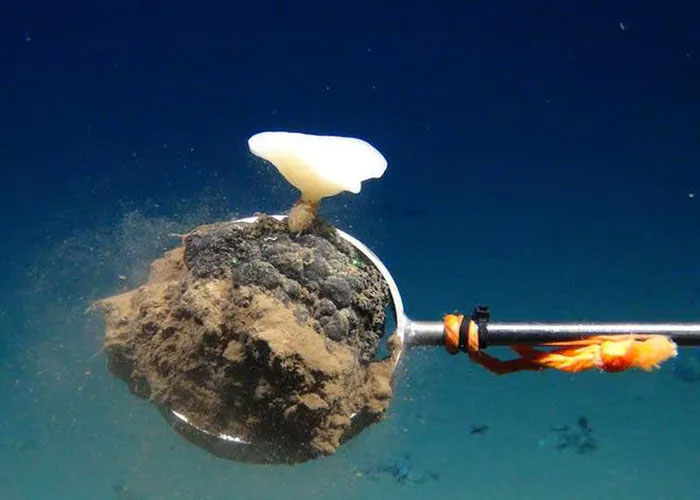 Hình ảnh cho thấy ở vùng biển Bắc Thái Bình Dương, một phương tiện vận hành từ xa thu thập một nốt sần kim loại đã cắp theo một sinh vật biển sâu đang phát triển trên đỉnh. Số phận của nó không khó để hình dung. (Ảnh: GEOMAR (CC BY 4.0))