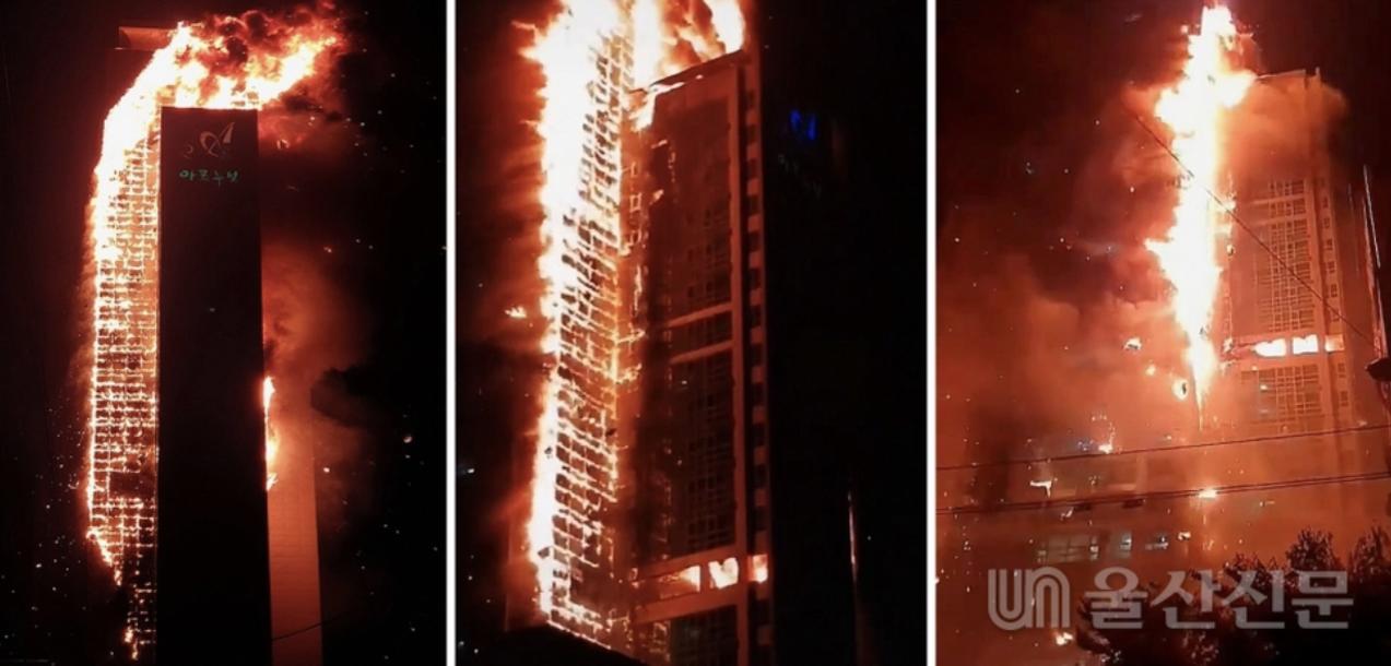 H́nh ảnh ngọn lửa bao trùm ṭa nhà 33 tầng vào đêm ngày 8/10/2020 (Ảnh Ulsanpress.net)