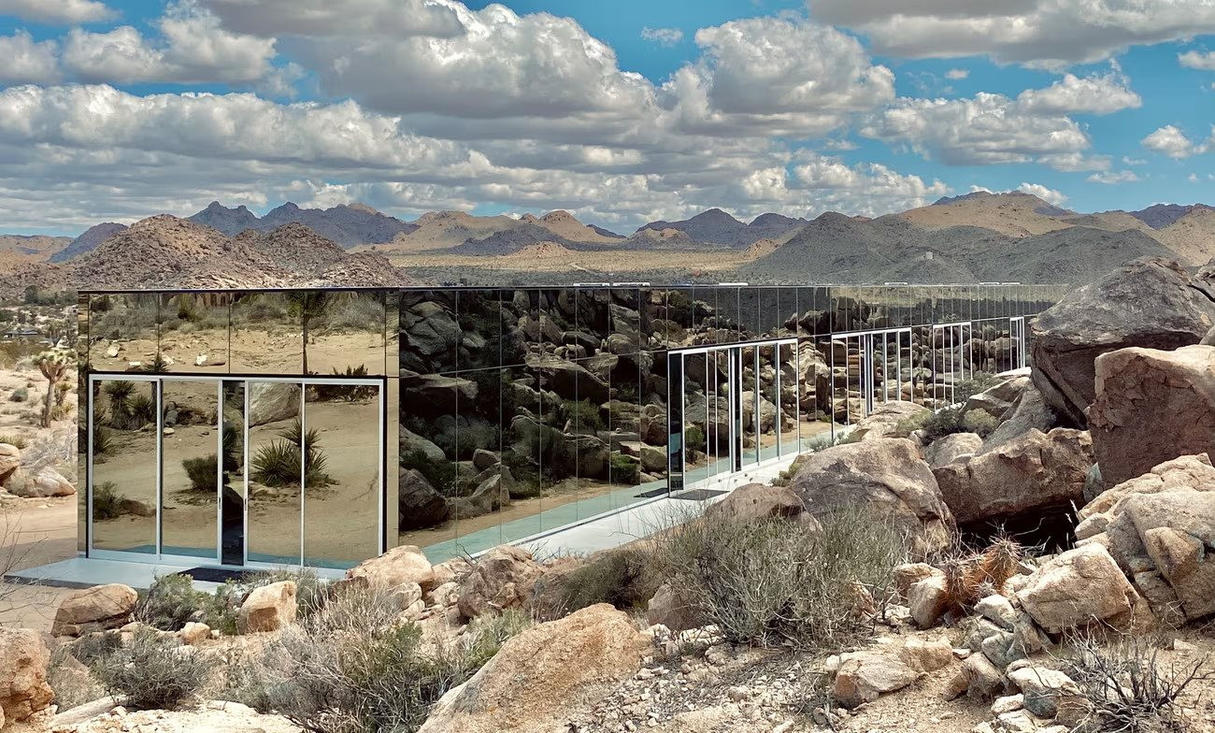 Ngôi nhà là cấu trúc siêu thực, giống chiếc hộp, với những bức tường kính phản chiếu phong cảnh sa mạc. Ảnh: Chris Hanley.