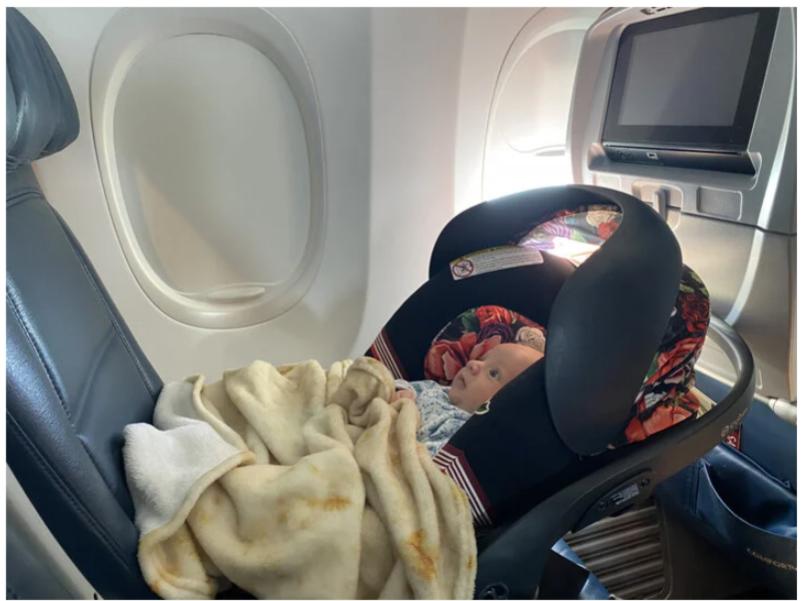 Trẻ em nên ngồi ở đâu khi đi máy bay? Cục Hàng không Liên bang Mỹ cho rằng trẻ dưới 2 tuổi nên được đặt vào ghế dành riêng cho trẻ em trên ô tô thay vì ngồi trong lòng bố mẹ. (Ảnh: Anna Everywhere)