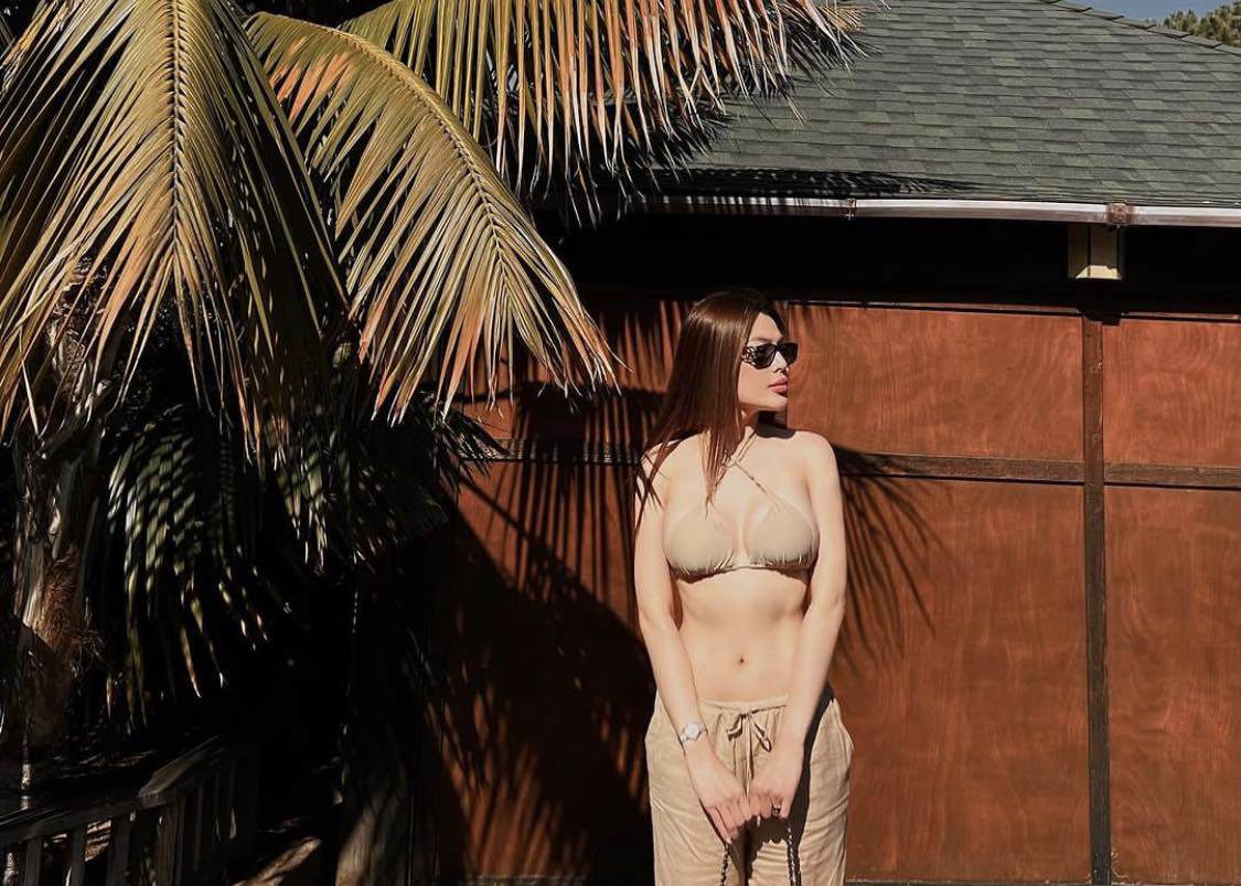 Người đẹp Phùng Trương Trân Đài gây chú ý khi đi dạo biển California trong set đồ màu nude bao gồm áo bơi và quần ống suông. Nhìn từ xa, bộ đồ của Trân Đài dễ khiến hiểu lầm vì tông màu gần như tiệp hẳn với màu da cùng chiếc áo có diện tích khá khiêm tốn. Để tạo điểm nhấn cho outfit, Trân Đài phối cùng mắt kính gọng vuông tone sur tone với túi xách Classic Flag Bag đến từ thương hiệu Chanel.
