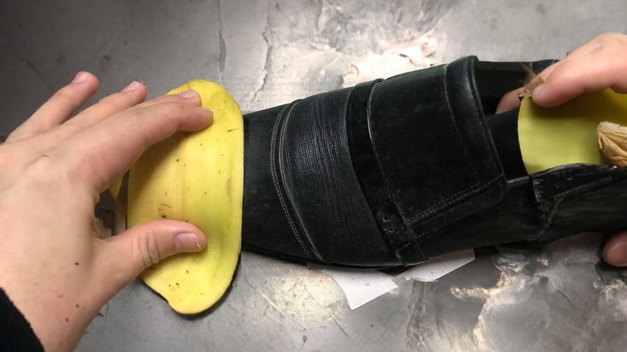 Bạn lột vỏ chuối chín rồi chà xát lên bề mặt đồ da. Chuối chín giúp lau đi bụi bẩn, vết nấm mốc và cũng làm bóng cho đồ da của bạn.