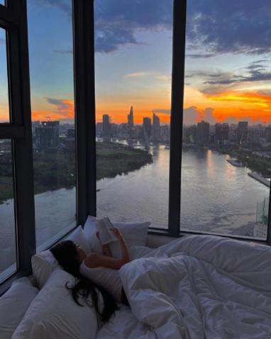 Đối với những ai mê nhà cửa, căn phòng ngủ ngắm view Bitexco tại TP.HCM của Lê Hồng Oanh không còn xa lạ gì. Căn phòng này từng gây bão trên MXH với những clip time-lapse hàng trăm triệu lượt xem. Chính chủ chẳng cần làm gì, cứ nằm dài trên giường đọc sách, làm việc,... cũng đủ tạo cảm giác thoải mái, thư giãn.