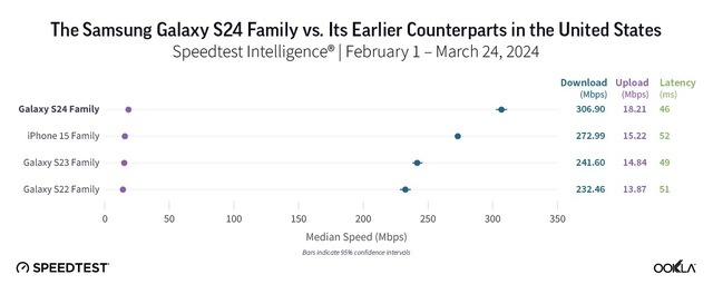 Ở Mỹ, Galaxy S24 có tốc độ trung bình nhanh hơn 34 Mbps so với dòng iPhone 15: