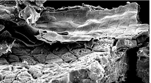 Hình ảnh hiển vi của cấu trúc vi mô bên trong của lớp vỏ thực phẩm cho thấy các hạt hạt emmer. (Ảnh: L. Kubiak-Martens, BIAX)