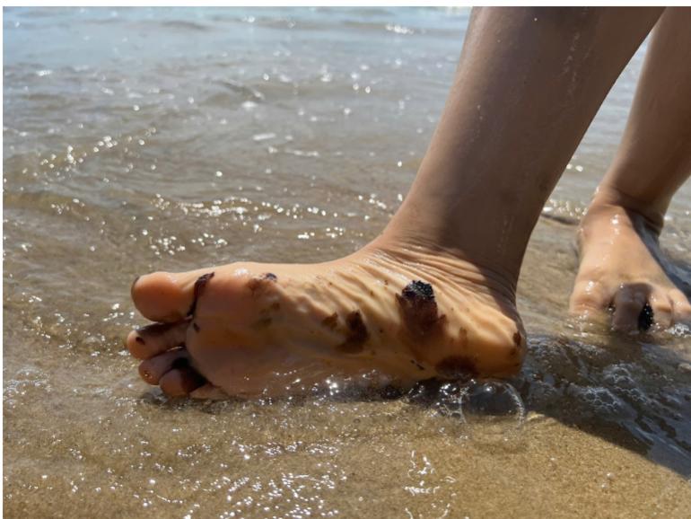 Trong khi đó, bà Trần Thị Xuân Liễu (du khách từ Bình Thuận) cùng với gia đình của mình đến Nha Trang từ sáng 1/9. Bà Liễu không biết sự việc dầu nhớt vón cục ở bờ biển Nha Trang nên sáng nay khi tắm biển lên bà Liễu bất ngờ vì thấy chân các cháu bị dính đầy dầu.