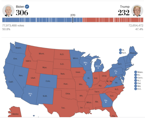 Georgia goes to Joe Biden and North Carolina to Donald Trump, putting Biden on 306 Electoral College Votes and Trump on 232