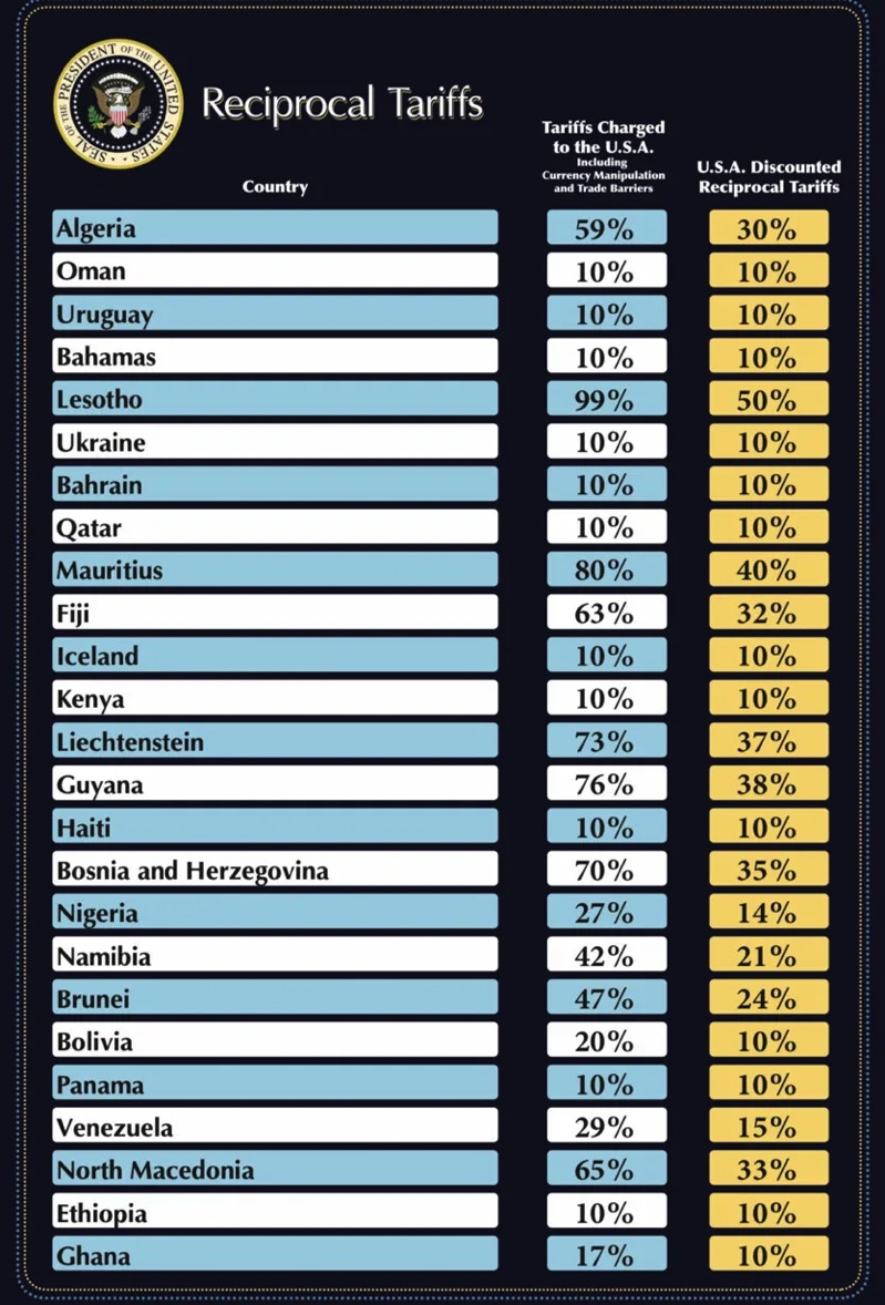 Liên minh châu Âu sẽ phải chịu mức thuế 20% và Việt Nam phải chịu mức thuế 46%, theo các tài liệu của Nhà Trắng cho biết. Các nước khác bị áp mức thuế cao hơn bao gồm Nhật Bản ở mức 24%, Hàn Quốc ở mức 25%, Ấn Độ ở mức 26%, Campuchia ở mức 49% và Đài Loan ở mức 32%. Trong một hành động phô trương, Trump đã giơ những tấm bảng lớn trong bài phát biểu dài 48 phút của mình, hiển thị mức thuế mới của từng quốc gia.