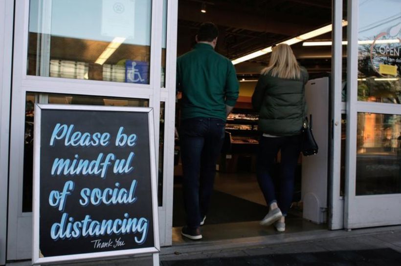 Người mua hàng bước vô một cửa hàng tạp hóa ở Seattle, Washington, Hoa Kỳ, có tấm bảng đề nghị giữ khoảng cách an toàn (David Ryder, Reuters)