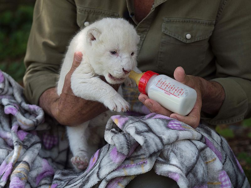 BẠCH VƯƠNG..Sư tử trắng Lần đầu tiên chào đời ở vườn thú Tây Ban Nha.Hôm 31-05-2020 nó bị con mẹ bỏ rơi ngay từ lúc mới đẻ và đang được các nhân viên của vườn thú chăm sóc. Ảnh nghệ thuật của AFP-Hương Hảo.