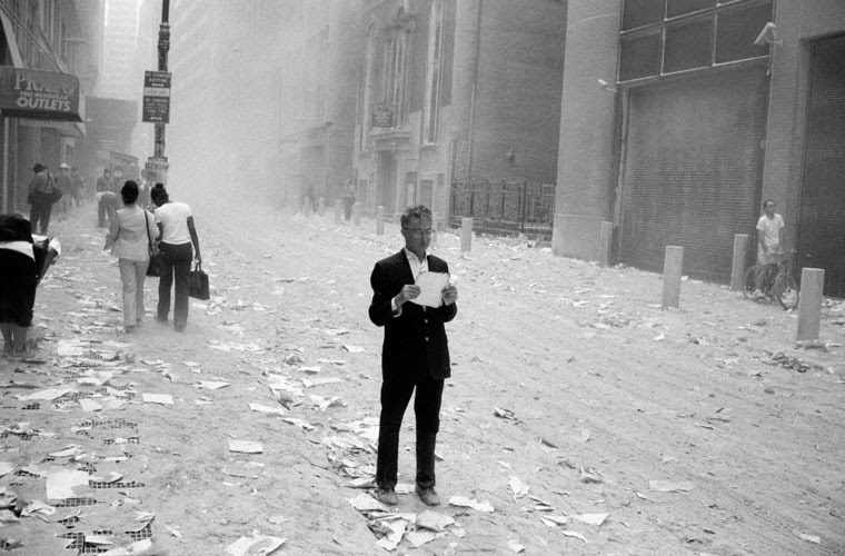 Người đàn ông choáng váng đang cầm trên tay một mảnh giấy bị hất văng từ hai tòa tháp.