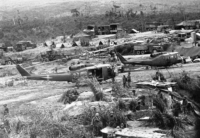 TPC Bửu đă được nói chuyện trực tiếp với TPC Giang từ trong đồi 31 và được biết, ngày hôm qua khi bay vào vùng, Giang đă dùng chiến thuật “lá vàng rơi”, từ trên cao cúp máy auto xoáy trôn ốc xuống, nhưng v́ pḥng không địch quá dày đặc nên khi gần đến đất, phi cơ anh bị trúng đạn rớt xuống găy đuôi nằm bên cạnh ṿng rào pḥng thủ ngoài cùng của Lữ Đoàn 3 Dù. Phi hành đoàn vô sự, chỉ có copilot là Vơ Văn On bị xây xát nhẹ ở cổ, tất cả chạy thoát được vào trong căn cứ Dù. Nhưng trước khi bỏ phi cơ, cơ phi Trần Hùng Sơn không quên vác theo cả cây M60 trên cửa máy bay nữa. Rút kinh nghiệm, hôm nay Bửu bay cạ-càng bánh xe lướt thoang thoáng trên ngọn cây theo chiến thuật biệt- kích razed-mode lướt từ hướng Đông-Tây đi vào, nhưng làm sao đừng gây ra tiếng động. Trên đường bay dọc theo quốc lộ số 9 TPC Bửu c̣n nh́n thấy những cột khói bốc lên nghi ngút, chứng tỏ pháo binh của Mỹ nơi Khe Sanh bắn rất chính xác và hiệu qủa. Gần đến LZ, Bửu đổi hướng lấy Đông Nam, roi Tây Bắc để đáp xuống; Vừa ló ra khỏi rặng cây, Trưởng Phi Cơ Bữu đă thấy chiếc Gunship của TPC Thục bay ṿng lại, cùng với tiếng Thục la lên trong máy “Bửu coi chừng pḥng không ở hướng Đông Nam”. Từ trên phi cơ nh́n xuống, giữa màu xanh trùng điệp của rừng cây nhiệt đới, ngọn Đồi 31 đỏ quạch nổi bật với những đốm bụi đất tung lên từng cơn v́ đạn pháo kích đào xới của cộng quân Bắc Việt. Không nao núng, Bửu vẫn điềm tĩnh tiếp tục đáp xuống; Khi phi cơ c̣n cách mặt đất độ 15 thước th́ trúng mảnh đạn cối 120ly, khắc-tinh chống trực thăng, phi cơ phát hoả, bùng lên một đám khói bao trùm cả phi cơ, cơ phi Em la lên khẩn cấp trong máy “đáp xuống, đáp xuống anh Bửu ơi, máy bay cháy”. Cùng lúc Bửu cũng cao tiếng báo động cho chiếc số 2 “Yên ơi, tao bị trúng đạn rồi, đừng xuống nữa” trong khi vẫn b́nh tĩnh đáp xuống; May mắn là đạn trúng vào b́nh xăng sau đă hết xăng, chỉ c̣n ít hơi đốt, nên trực thăng không bắt cháy như chiếc của Thiếu-úy An ở Bù Đốp hôm nào.