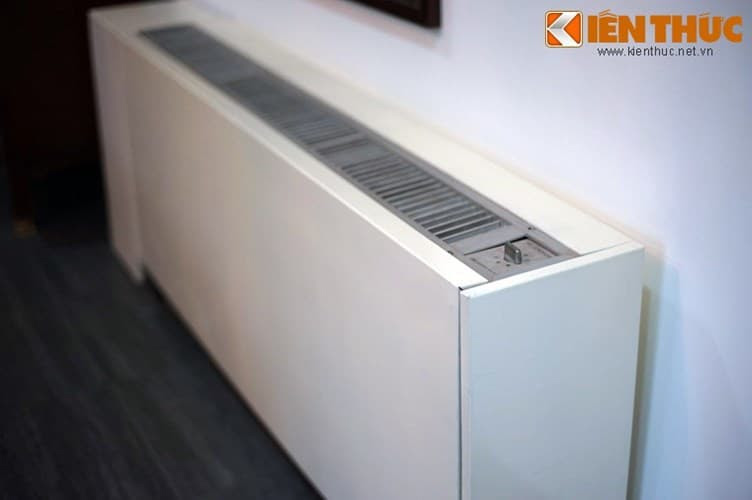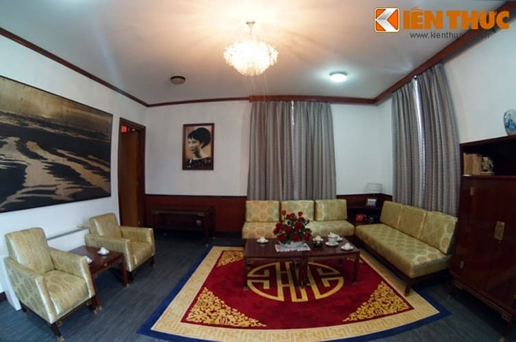 Bên trái căn phòng là nơi tiếp khách với các bộ bàn ghế sofa bọc vải vàng. Bức tường bên trái có bức ảnh khổ lớn về bãi biển miền Trung.