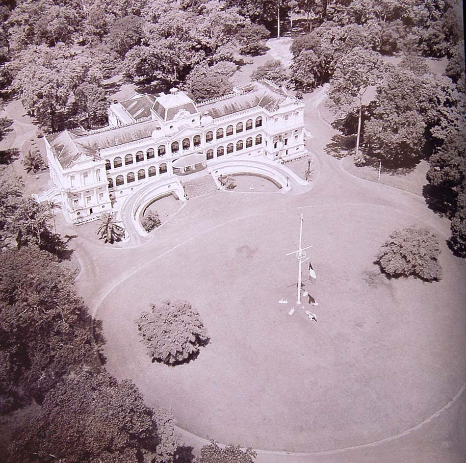 Dinh Độc Lập được xây từ năm 1868 theo kiến trúc Pháp đã hư hỏng hoàn toàn và không thể hồi phục do cuộc oanh tạc. TT Ngô Đình Diệm đã cho san bằng công trình này để xây một dinh thự mới trên nền cũ theo đồ án thiết kế của kiến trúc sư Ngô Viết Thụ. Ảnh: Vietnam Center and Archive.