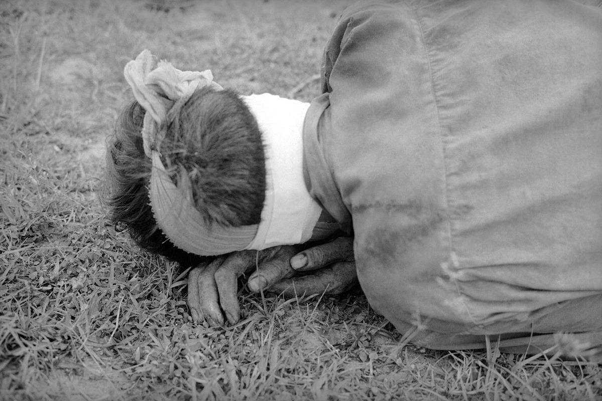 Một người phụ nữ đi chân trần đến bàn thờ đây là theo yêu cầu của phong tục. Ảnh chụp chánh điện chùa năm 1965.