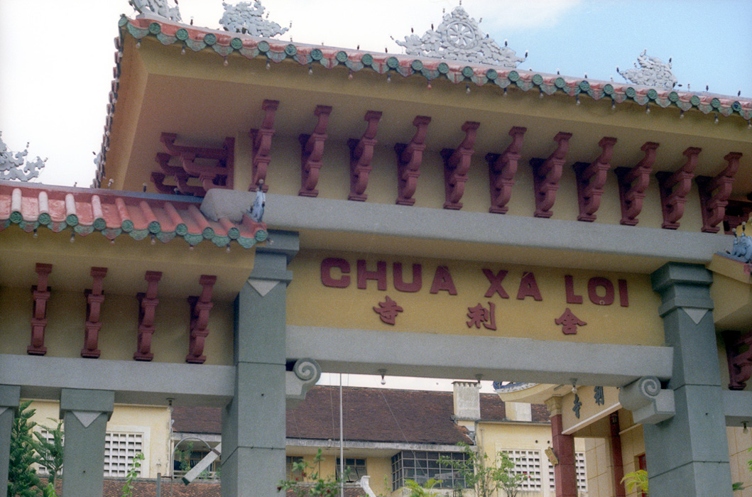 Cổng cнíɴн Chùa Xá Lợi trên đường Bà Huyện Thanh Quan – Biển thông báo màu vàng nơi cổng cho biết cổng này chỉ mở vào ngày đại lễ. Cổng phụ nằm trên đường LÊ VĂN THÀNH (nay là đường Sư Thiện Chiếu) ở phía bên phải chùa.