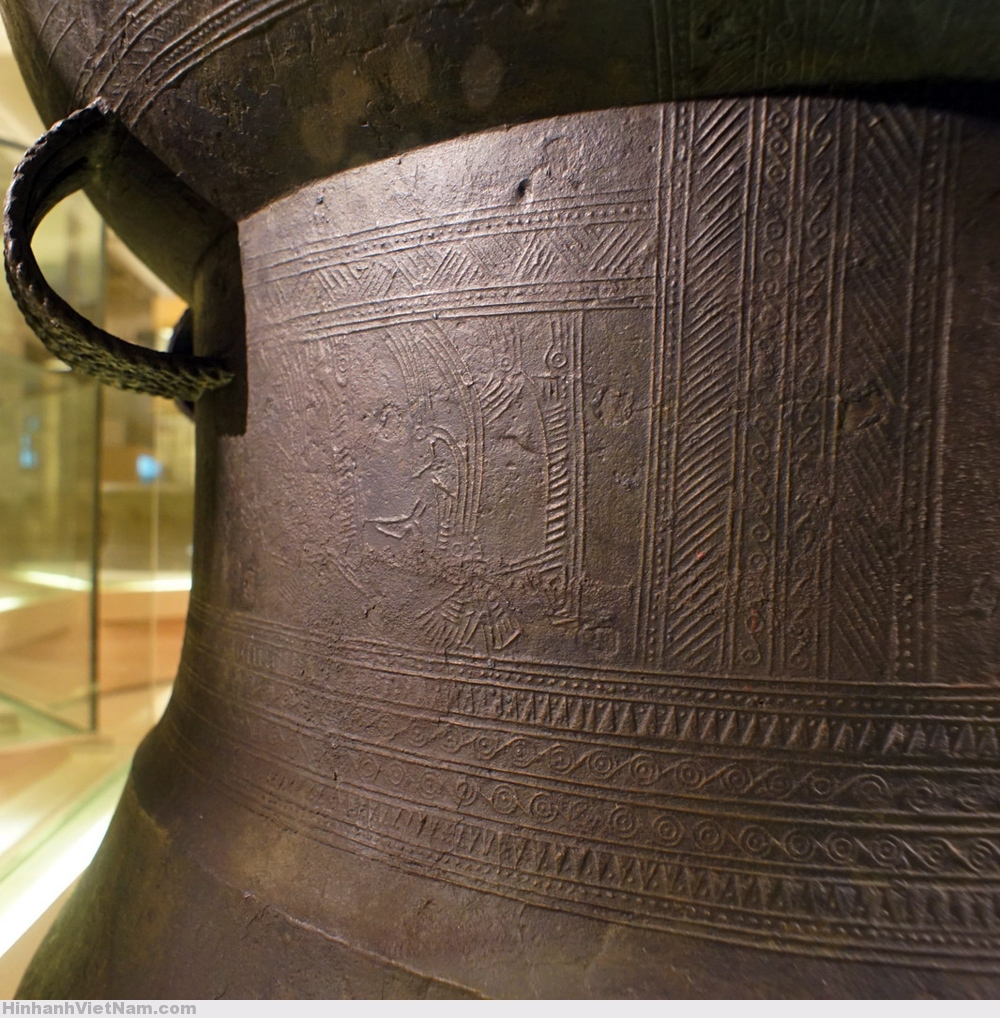 Phần dưới tang trống là 6 chiếc thuyền chuyển động từ trái sang phải, chở chiến binh tay cầm vũ khí và tù binh, xen giữa là những hình chim cò ngậm cá, chó săn được thể hiện theo lối cách điệu.
