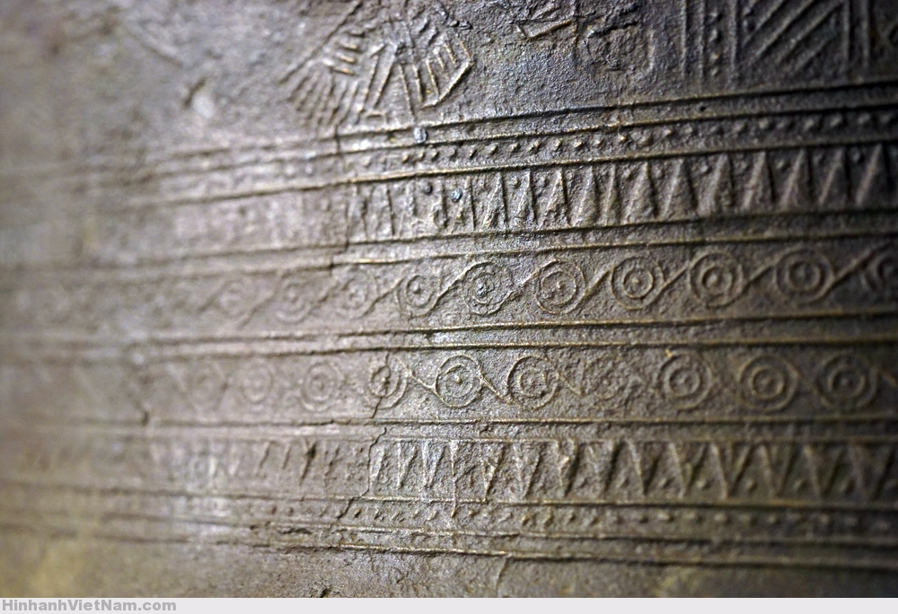 Tang trống chính là chiếc hộp cộng hưởng khuếch đại âm thanh. Phần trên có 6 vành hoa văn hình học. Vành 1 và 6: Những đường chấm nhỏ thẳng hàng. Vành 2 và 5: Văn răng cưa. Vành 3 và 4: Hoa văn vòng tròn đồng tâm chấm giữa nối với nhau bằng những tiếp tuyến song song.
