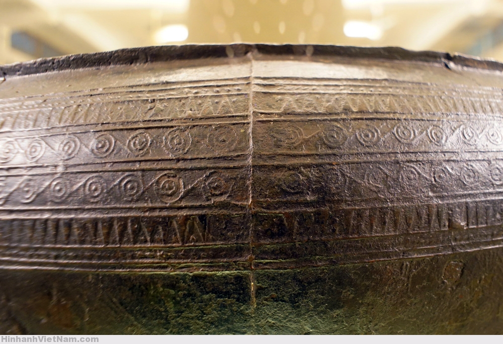 Phần dưới của thân là ba vành hoa văn hình học, giữa là vành văn vòng tròn chấm giữa có tiếp tuyến. Hai bên là hai đường chấm nhỏ. Ngoài cùng là hai đường chỉ trơn. Chân trống không có trang trí.