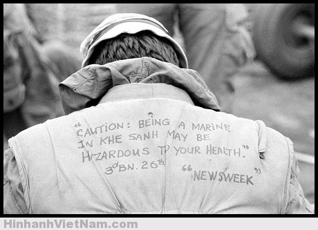 Lời nhắn viết trên áo trấn thủ của một lính Mỹ, thể hiện sự ám ảnh của anh ta trước mức độ ác liệt của chiến trường Khe Sanh: “Cảnh báo: Làm lính thủy đánh bộ ở Khe Sanh là một trải nghiệm có hại cho sức khỏe”. (Ảnh: thông qua dantri.com.vn)