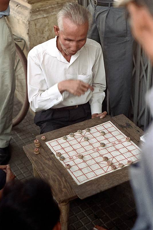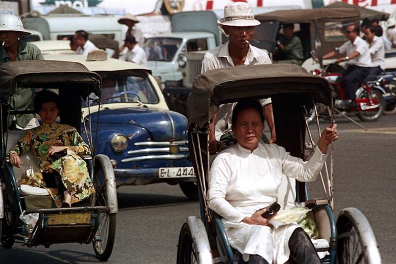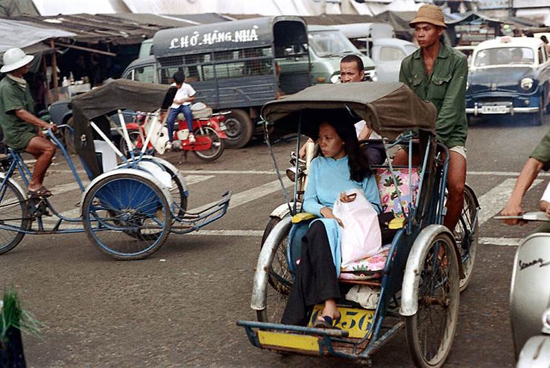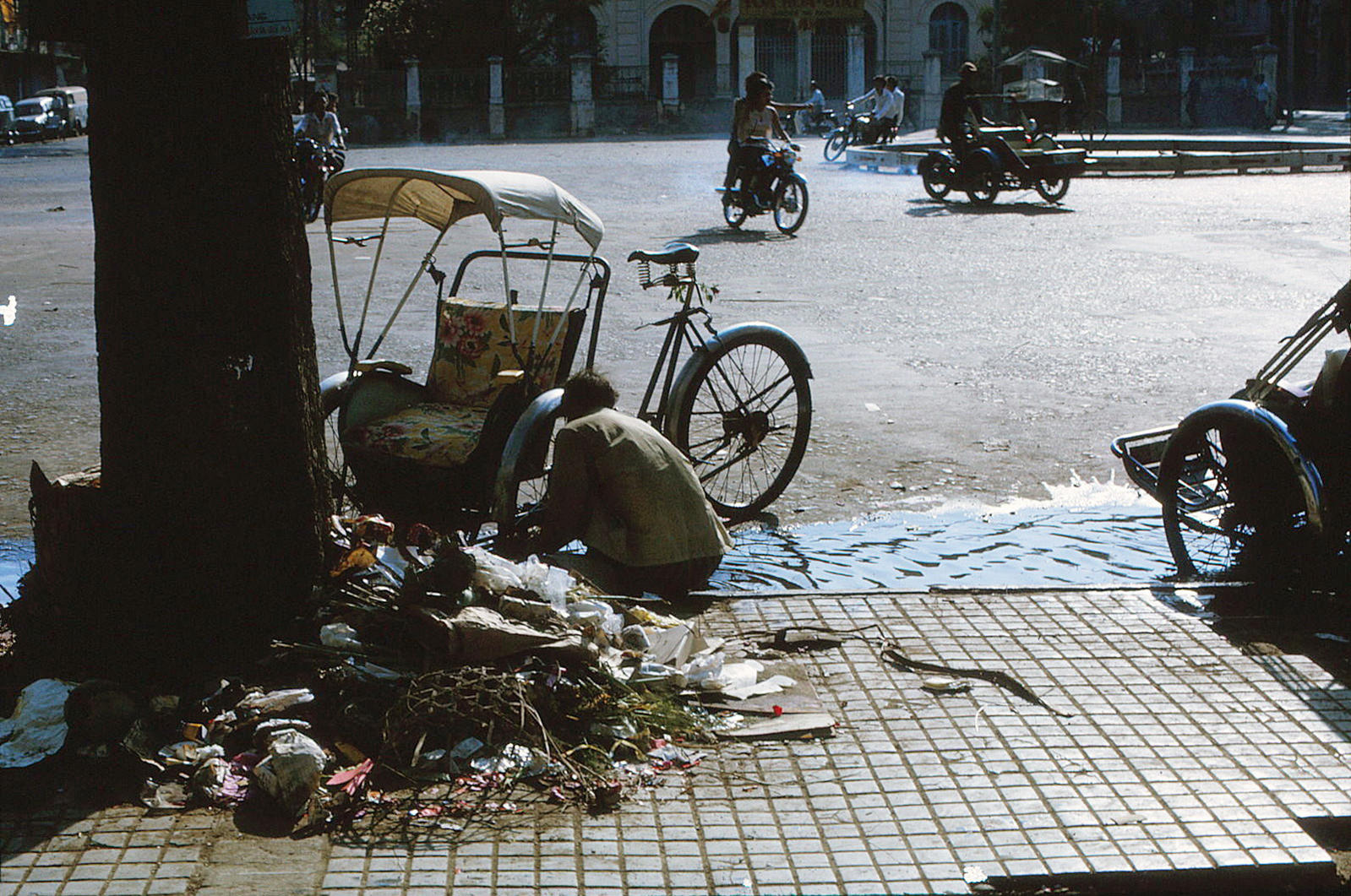 Một người đang tựa người bên chiếc xích lô để chờ khách, nghề này khá vất vả bởi nó cần sức người khá lớn nhưng tiền phía cho mỗi chuyến đi lại rẻ. Ảnh chụp năm 1968.