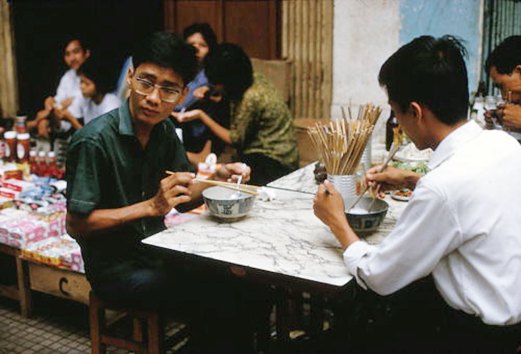 Bữa ăи sáng của người xưa cũng không khác mấy so với bây giờ, cũng là lề đường và chiếc bàn gỗ cùng ghế đẩu