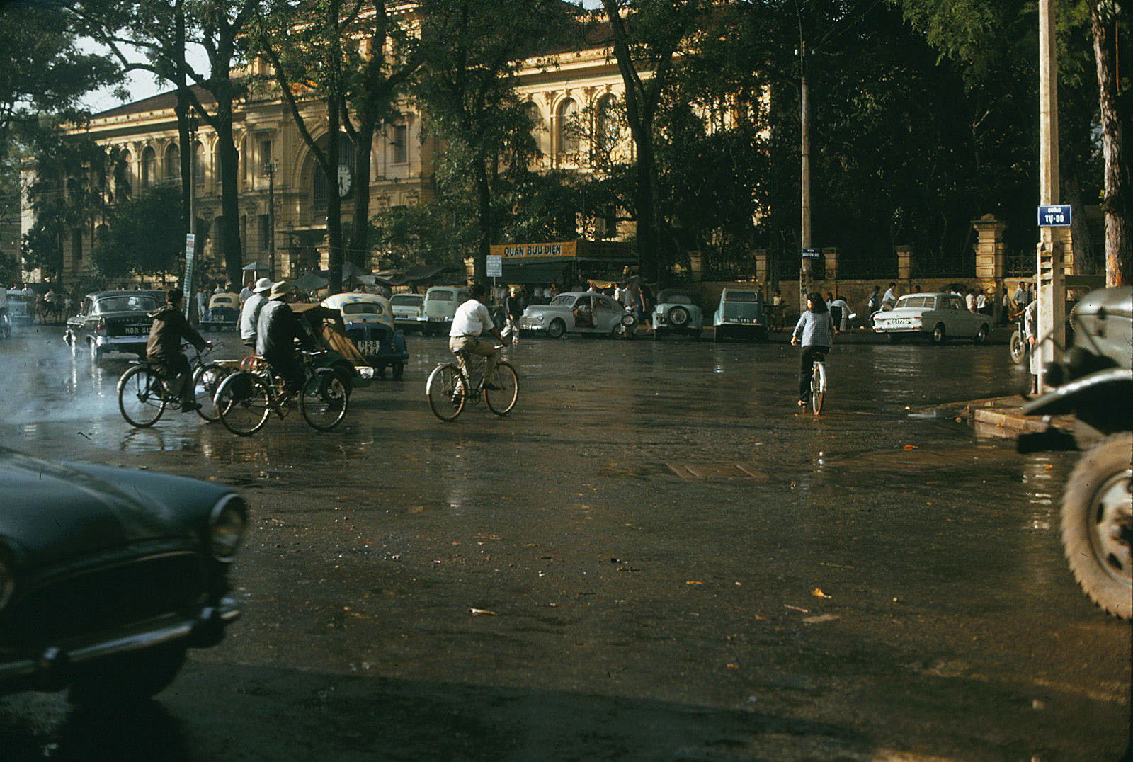 Cô gái chạy xe đẹp nơi gần ngã ba Công Lý-Bến Chương Dương. Tòa nhà trong hình là văи phòng của Thượng Nghị Viện do KTS Phạm Văи Thâng тнιết kế cuối thập niên 1960