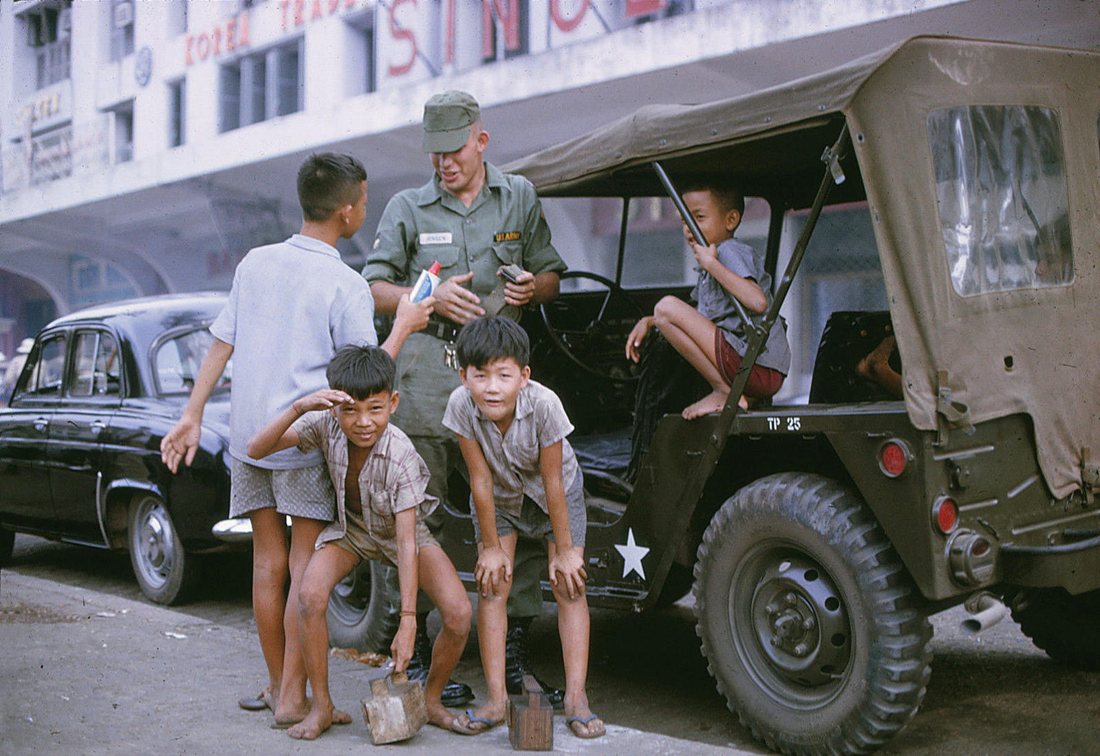Những đứa trẻ đánh giày và người lính Mỹ bên chiếc xe jeep trên đường Lê Lợi, cạnh thương xá TAX