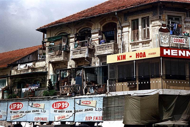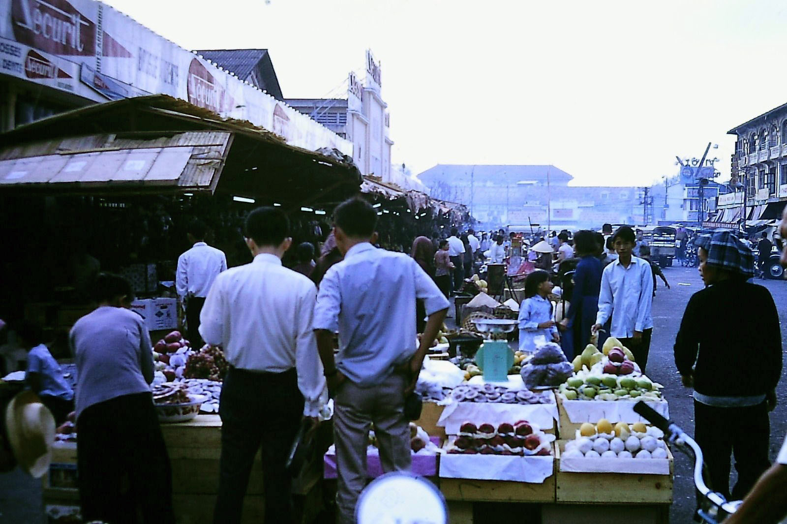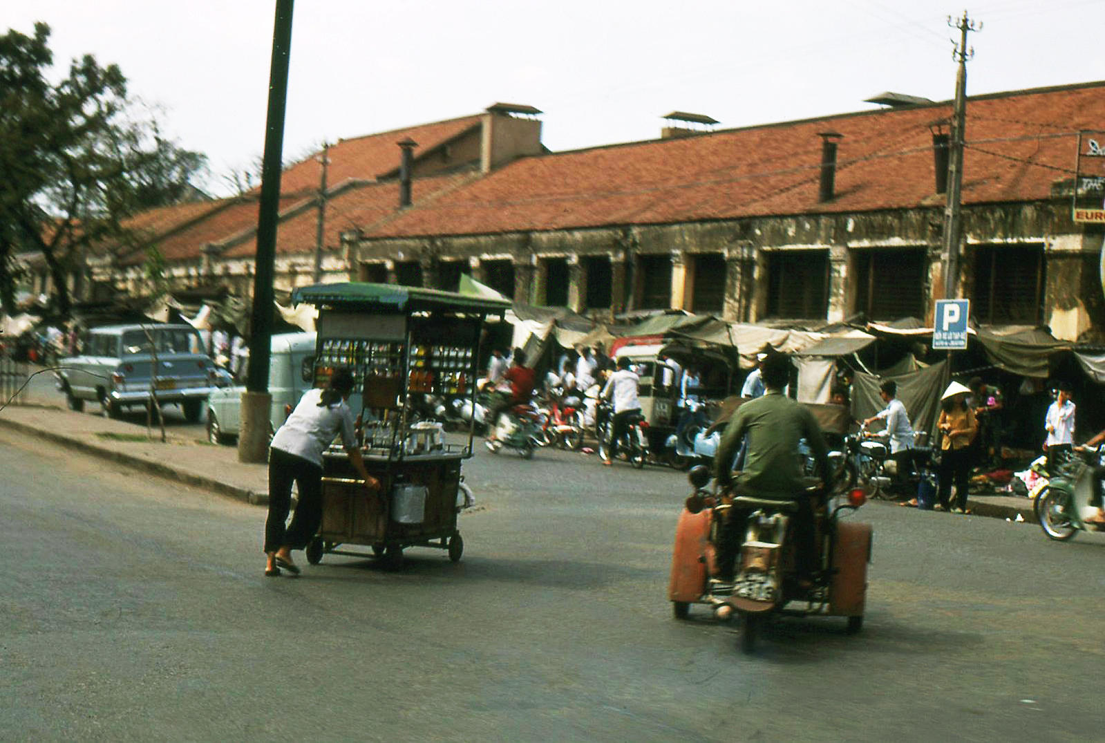 Đường Phan Châu Trinh, Cửa Tây Chợ Bến Thành năm 1968 – Nhà mái ngói nhô cao ở phía xa là biệt thự của chú Hỏa (Hui Bon Hoa) trên đường Phó Đức Chính, nay là Bảo tàng Mỹ thuật Thành phố Hồ Chí Minh.