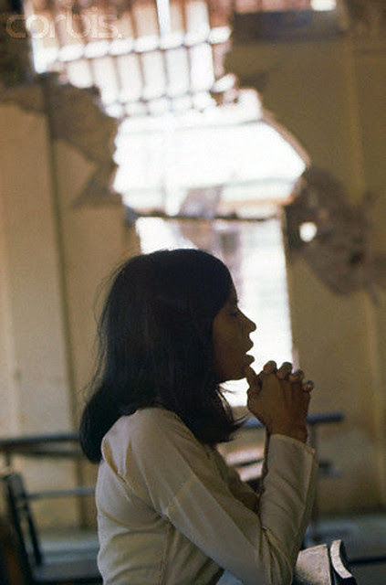 Hình ảnh người phụ nữ cầu nguyện trong nhà thờ bị hư hại nặng sau đợt rocket của VC vào thành phố Sài Gòn.
