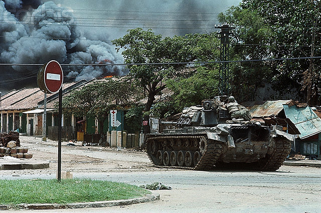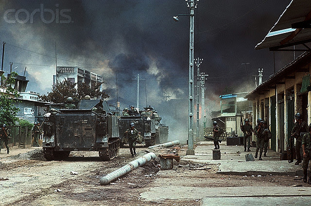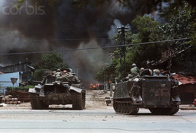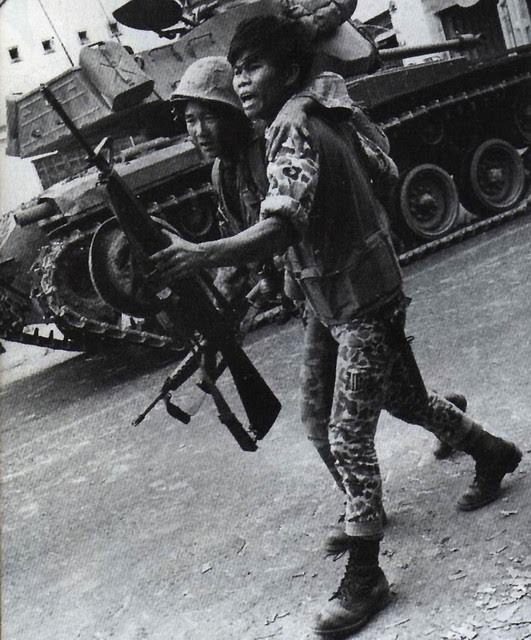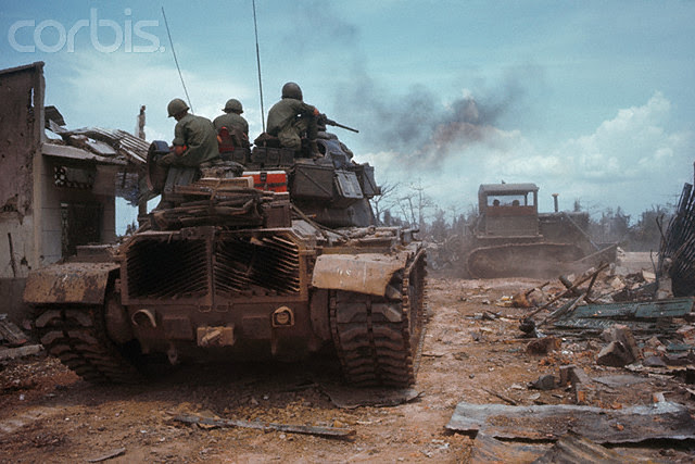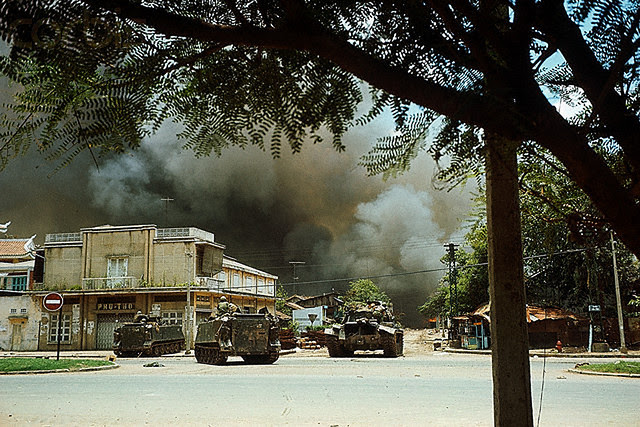 Khu vực này gần cầu chữ y : xe tăng Mỹ tham gia cùng quân lực VNCH truy quét tàn quân CS rút chạy và cố thủ trong các tòa nhà .