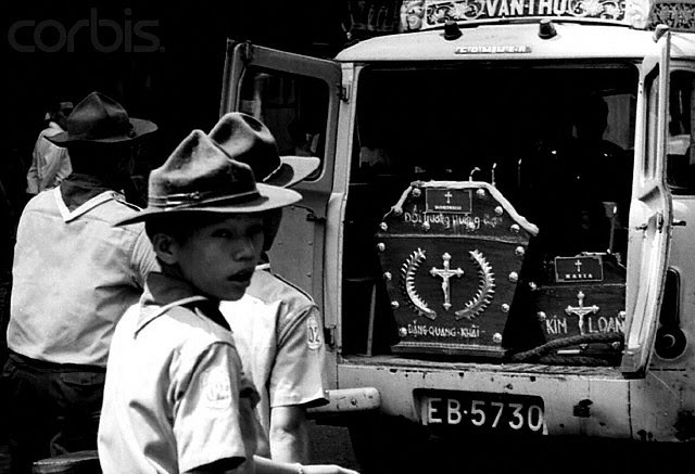 Những hướng đạo sinh theo sau một xe hòm đưa đám ma những người bạn đồng môn chết trong cuộc tấn công bất nhân của VC.